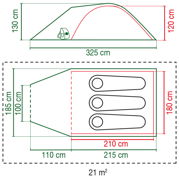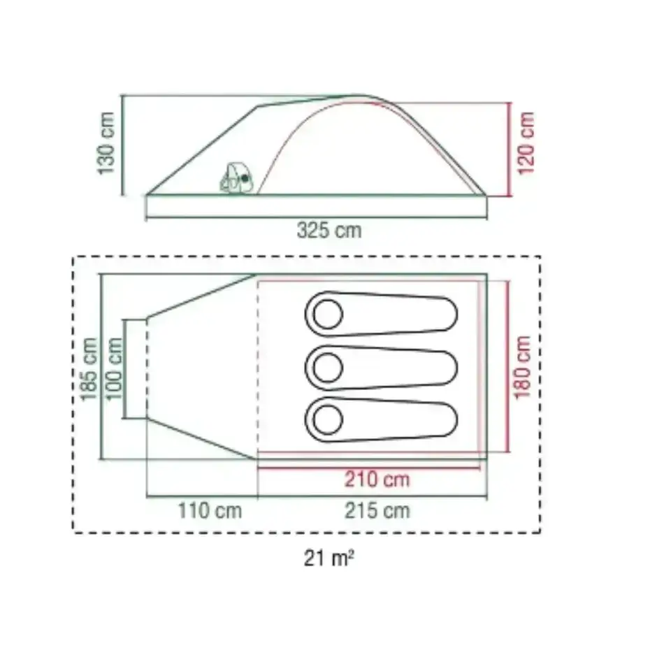 Wymiary po rozłożeniu 185 x 325 x 130 cm zapewniają przestrzeń użytkową odpowiednią dla małej grupy lub rodziny, a kompaktowe wymiary w torbie 52 x 20 x 20 cm i waga 4,9 kg ułatwiają transport i przechowywanie. Materiał z oddychającego poliestru poprawia komfort termiczny wewnątrz, a solidne wykonanie sprawia, że namiot sprawdzi się podczas krótkich wypadów weekendowych, festiwali oraz letnich wypraw w terenie.