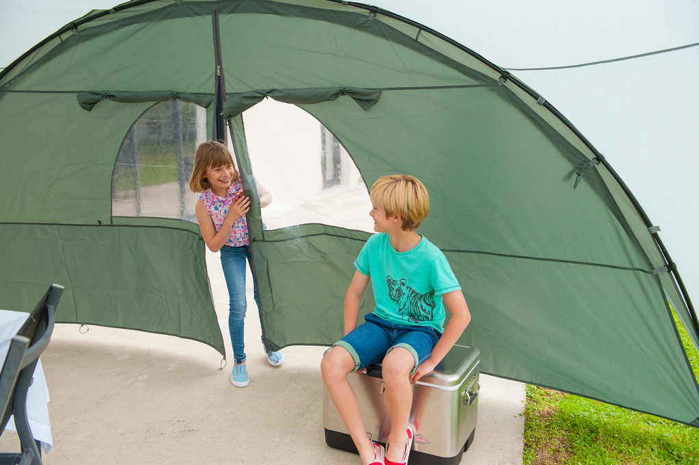 2. Pawilon imprezowy w postaci naszego namiotu (pamiętaj, żeby założyć ścianki!) doskonale ochroni przed deszczem Twoje przekąski, a także da dzieciom możliwość odpoczynku w suchym miejscu.